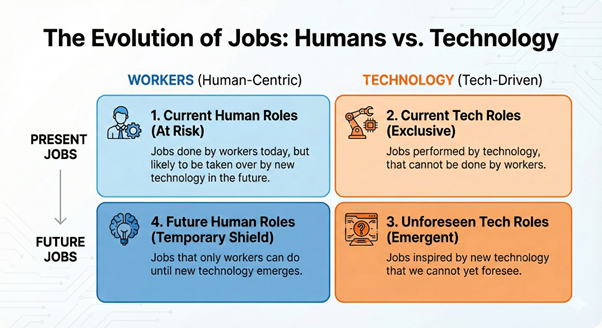 The chart splits work into four boxes. Top left? That’s your job today that a machine will probably do tomorrow. Top right? Work that machines already do that humans physically can’t. Bottom left? Jobs that’ll exist until the next wave of tech shows up. Bottom right? Careers we haven’t even invented yet because the technology doesn’t exist.